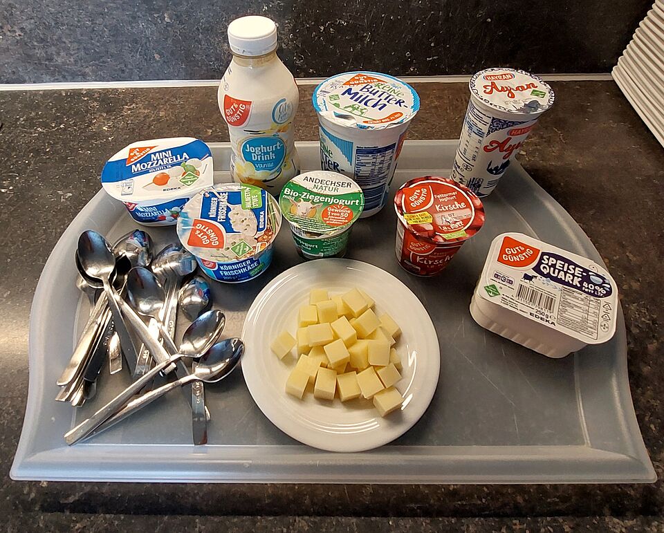 Im Anschluss wurde es kulinarisch: Bei einer kleinen Verkostung wagten sich unsere Gäste an verschiedene Milchprodukte aus nah und fern. Besonders beliebt war der erfrischende Joghurtdrink in der Geschmacksrichtung Vanille. Ganz anders dagegen der Ayran – das salzige Joghurtgetränk aus dem Nahen Osten spaltete die Meinungen. Auch Ziegenjoghurt stand auf dem Probiertisch – hier war etwas Überwindung gefragt, nicht alle wurden mit dem Geschmack warm. Abgerundet wurde die Verkostung mit einem Stück kräftigen Bergkäse, das vielen gut gefiel.