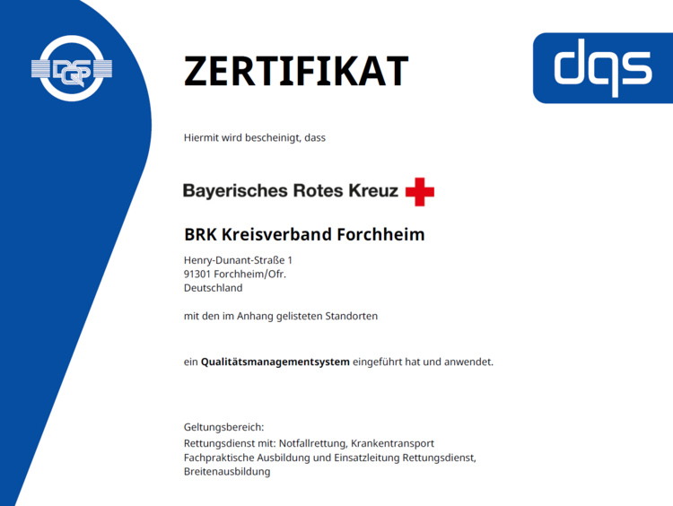 Der Rettungsdienst und die Breitenausbildung des BRK KV Forchheim haben erneut ihre hohe Qualität unter Beweis gestellt. Die Auditoren Werner Ströbel und Michael Bittner von der Deutschen Gesellschaft zur Zertifizierung von Managementsystemen (DQS) haben die Organisation erfolgreich rezertifiziert, wodurch das begehrte Zertifikat für weitere drei Jahre gesichert ist.